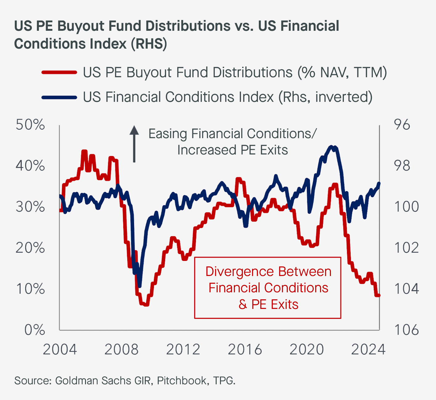 Exhibit 1: US PE Exits Have Lagged Despite Easing Financial Conditions, Which Could Change in 2025