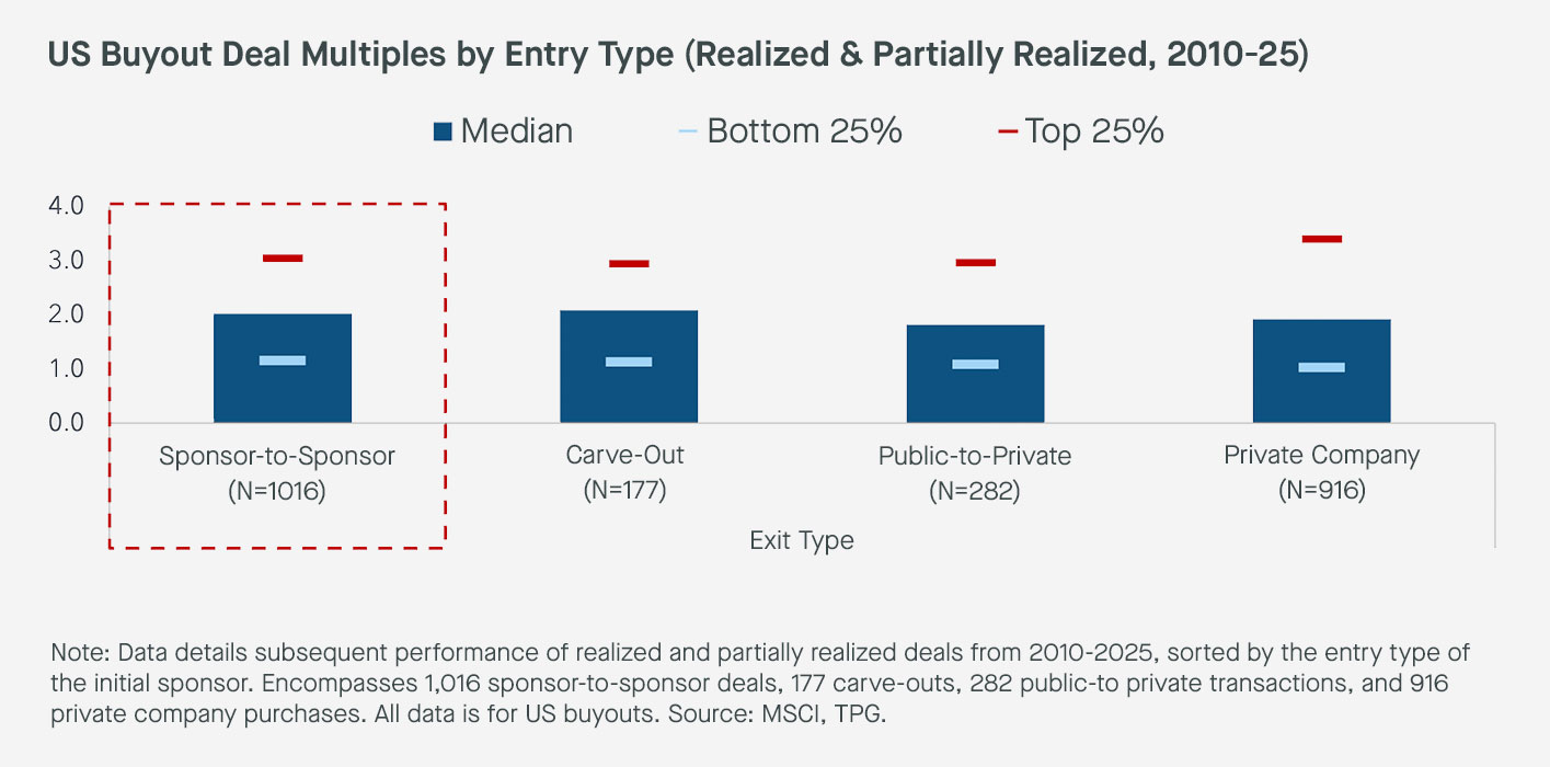 Despite sponsor-to-sponsor transactions representing a second cycle of PE ownership of the same company, they’ve consistently generated performance in line with primary buyouts (where a company is owned by PE for the first time—see Exhibit 5). We believe the single-asset CV market is predominately accessing deals from the sponsor-to-sponsor market and is well positioned to access a slice of the best-quality assets from this deal flow, given the economic incentives for GPs to move their best assets into a CV.