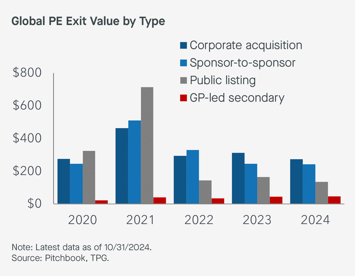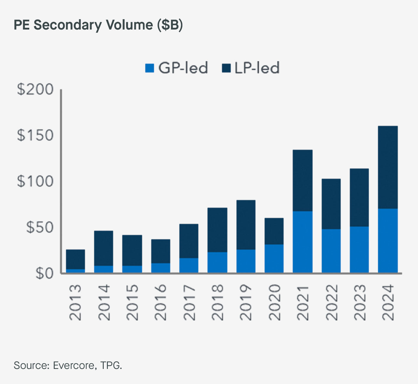 In coming years, we expect strong continued growth in the private equity secondaries market and demand for single-asset CVs, in particular. GP-led secondaries delivered a record year in 2024, with total exit value of around $70B. That said, we believe the market remains highly undercapitalized relative to the overall opportunity.