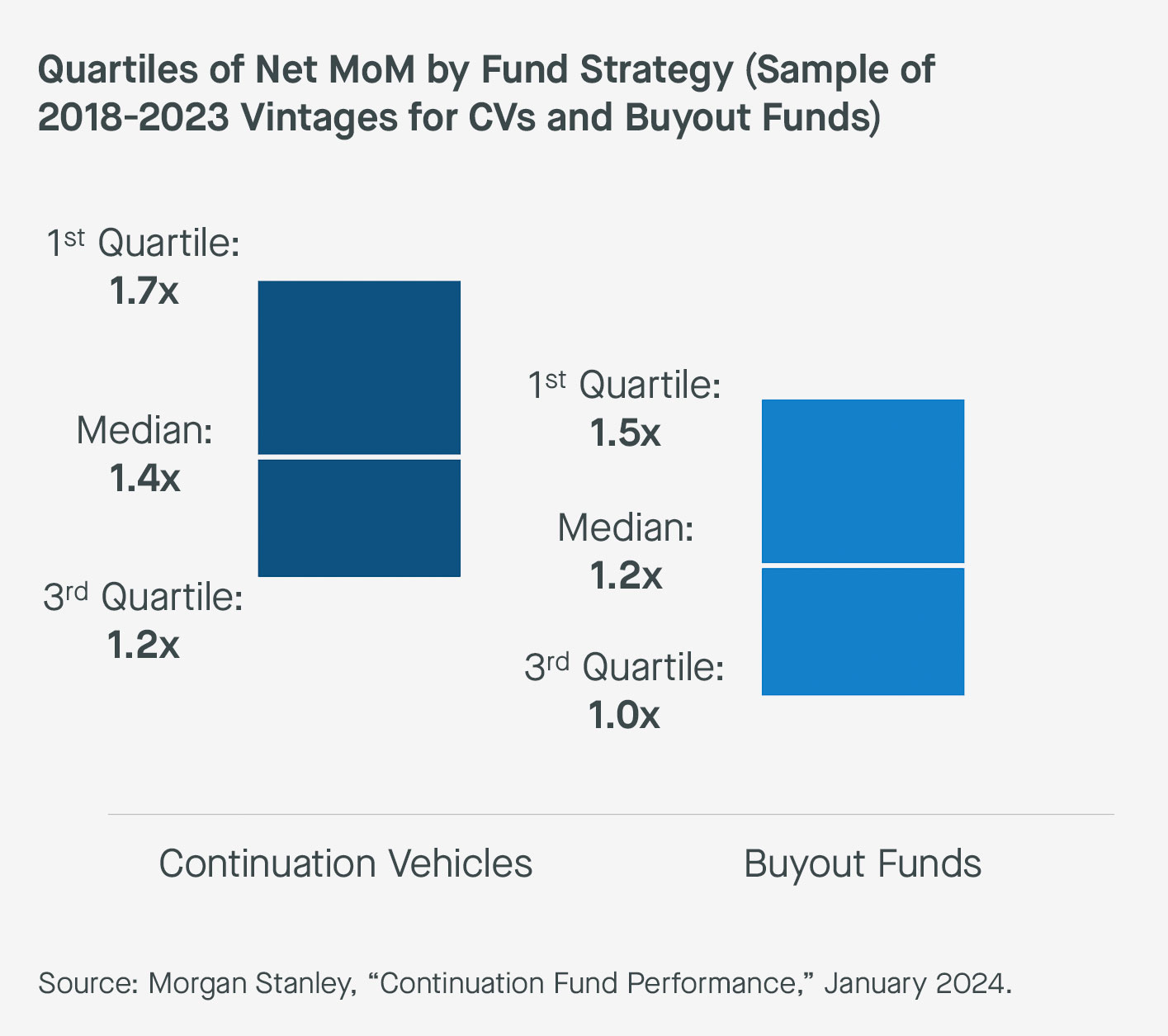 From our experience, sponsors are consistently selecting their best assets to roll into single-asset CVs precisely because they expect to realize further upside. To this end, the performance of CVs has been ~0.2-0.3x stronger in terms of MoM relative to buyout funds across the first, median, and third quartiles from 2018-23 (see Exhibit 3). This gap reflects the positive selection bias inherent in single-asset CVs, where a sponsor is actively choosing to extend their hold period and, in many instances, increase their investment.