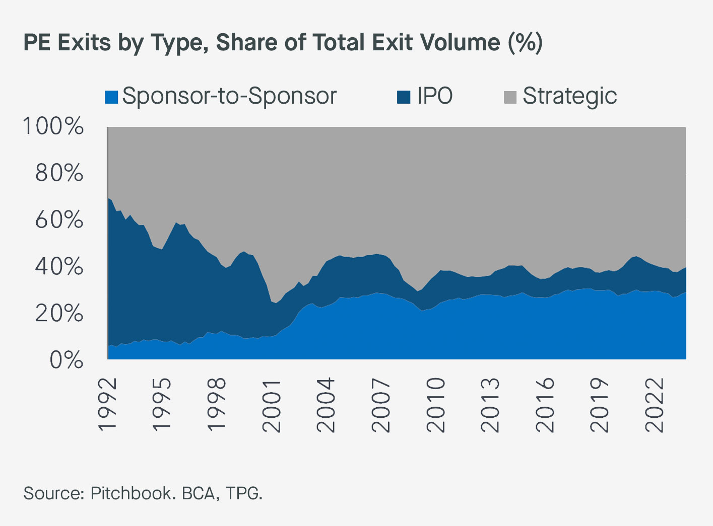 The rapid growth of single-asset CVs coincides with a broader secular trend towards the increased use of sponsor-to-sponsor exits across private equity (see Exhibit 4). Such exits have grown from around 5% of total exit volume to almost 20% over the past few decades.